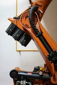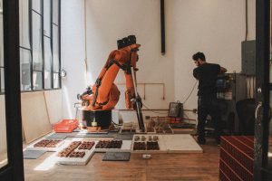 En este proceso de investigación, trabajaron en colaboración con el Laboratorio de Materiales y Sistemas Estructurales de UNAM, que proporciona una perspectiva científica al proyecto. Finalmente, después de numerosos procesos y pruebas, se obtiene un material para la fundición combinado con un aglutinante. Este material se convierte entonces en un estado plástico utilizando un extrusor diseñado para materiales semilíquidos, que se monta en un brazo robótico.