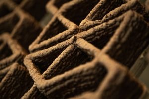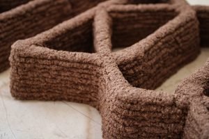 La transición de un proceso de fabricación sustractivo a uno aditivo condujo a la exploración de nuevos enfoques. Para fabricar las baldosas modulares a partir del biocompuesto, fue necesario comprender el peso, la densidad y el contenido de agua de cada material. A su vez, se utilizaron aglutinantes orgánicos como matriz, junto con cal, que, después de varias pruebas, resultó ser más efectiva para prevenir el crecimiento de hongos.
