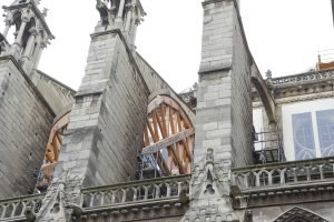 El devastador incendio de 2019 destruyó la compleja estructura del techo. De hecho, debido a la gran cantidad de madera utilizada en el techo, solía ser llamado La Forêt, en francés significa El Bosque. Esta estructura del techo se presentó como un grave problema, con algunos diciendo que sería imposible reconstruirlo simplemente debido a la gran cantidad de árboles utilizados en su construcción. Los restauradores recurrieron a artesanos en Guédelon, un castillo en construcción a 2 horas al sur de París, donde los carpinteros están capacitados en carpintería medieval. El proyecto Guédelon es un experimento arqueológico, un castillo construido solo con las herramientas y métodos disponibles en la Edad Media y materiales de origen local. Hoy en día, Guédelon desempeña un papel inesperado y vital en la restauración de La Forêt de Notre Dame.