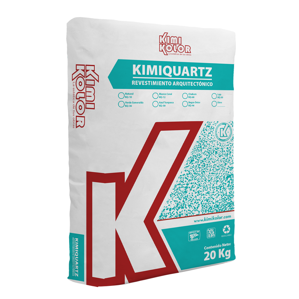 Kimiquartz es mortero arquitectónico cementoso con agregado expuesto que sirve para dar acabados en distintos tipos de superficies, en interiores y exteriores.